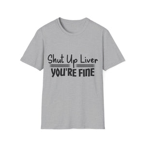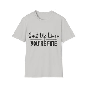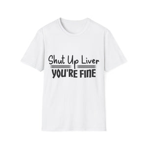 This unisex softstyle T-shirt features the funny quote 'Shut up liver you're fine'. Made from 100% ring-spun cotton, it is lightweight and perfect for everyday wear. The classic fit and crew neckline make it versatile for any occasion, whether casual or dressed up. The shirt is ethically made with sustainable practices, ensuring both quality and comfort.